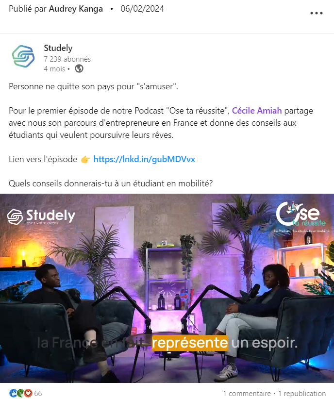 Dans le cadre de ma collaboration sur une durée d’un an avec Studely, fintech innovante dédiée aux services financiers pour étudiants internationaux en mobilité, j’ai été responsable de la création de contenu LinkedIn et de la gestion globale des réseaux sociaux. L’objectif principal était de renforcer la visibilité et la notoriété de la marque, d’accroître son influence sur LinkedIn et d’engager efficacement des audiences diverses, allant des étudiants aux partenaires B2B.